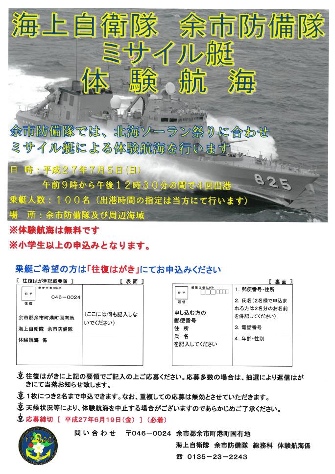 7月5日・海自・余市防衛隊のミサイル艦体験航海の抽選に外れちゃいました。期待してたんだけど残念。