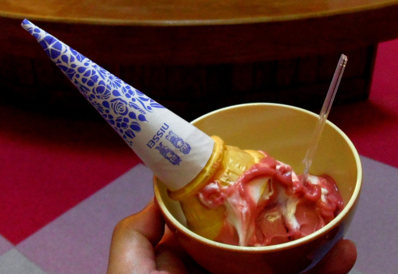 湯上がりにソフトクリームを食べようとしたら....手元で崩れた。