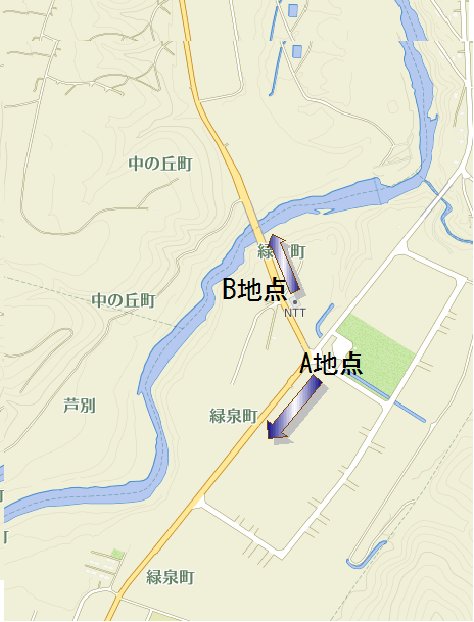B地点から中の丘を向いて撮影....橋は緑泉橋。川は芦別川。