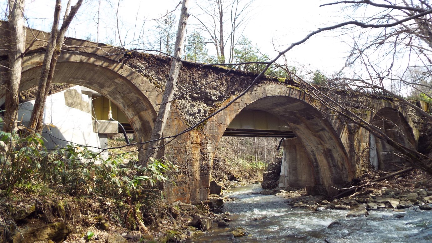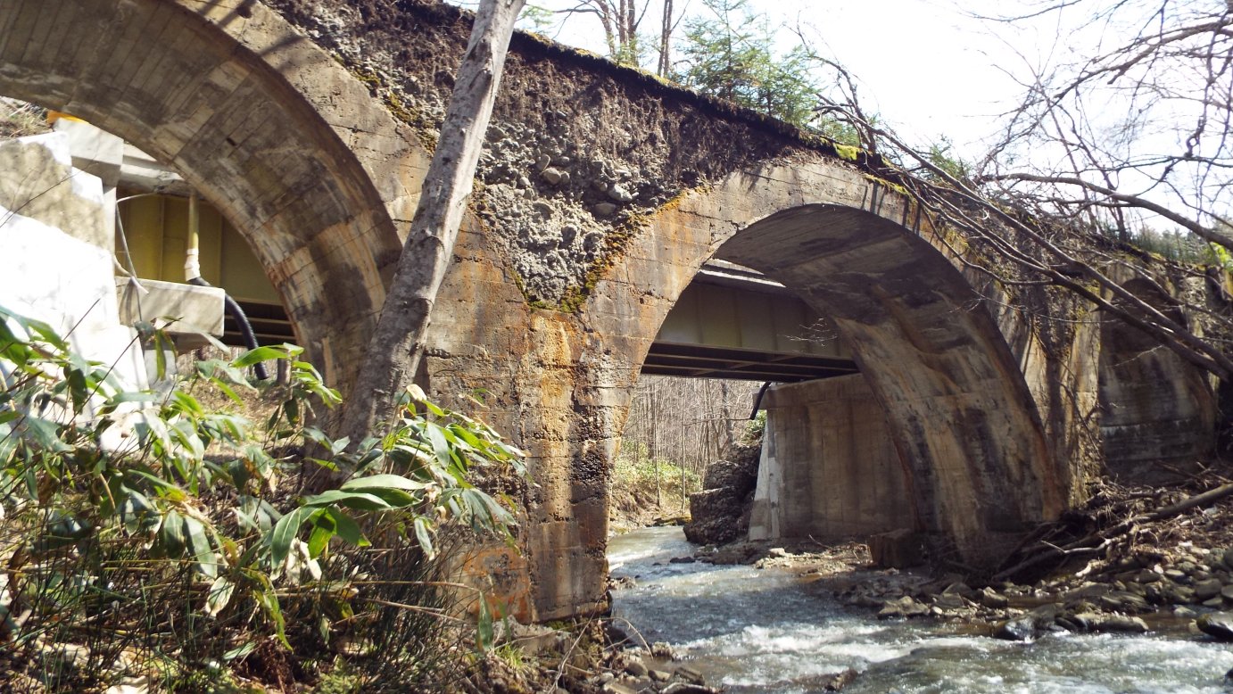 旭へ出たあたりに...トンネルの前の橋だが橋桁だけが残っている。