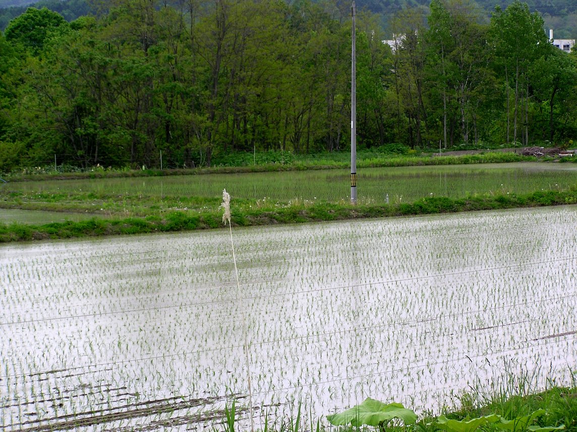 昨日まで水をはった状態だのが、今日のお昼頃...横を通ったら田植えを終えていた。