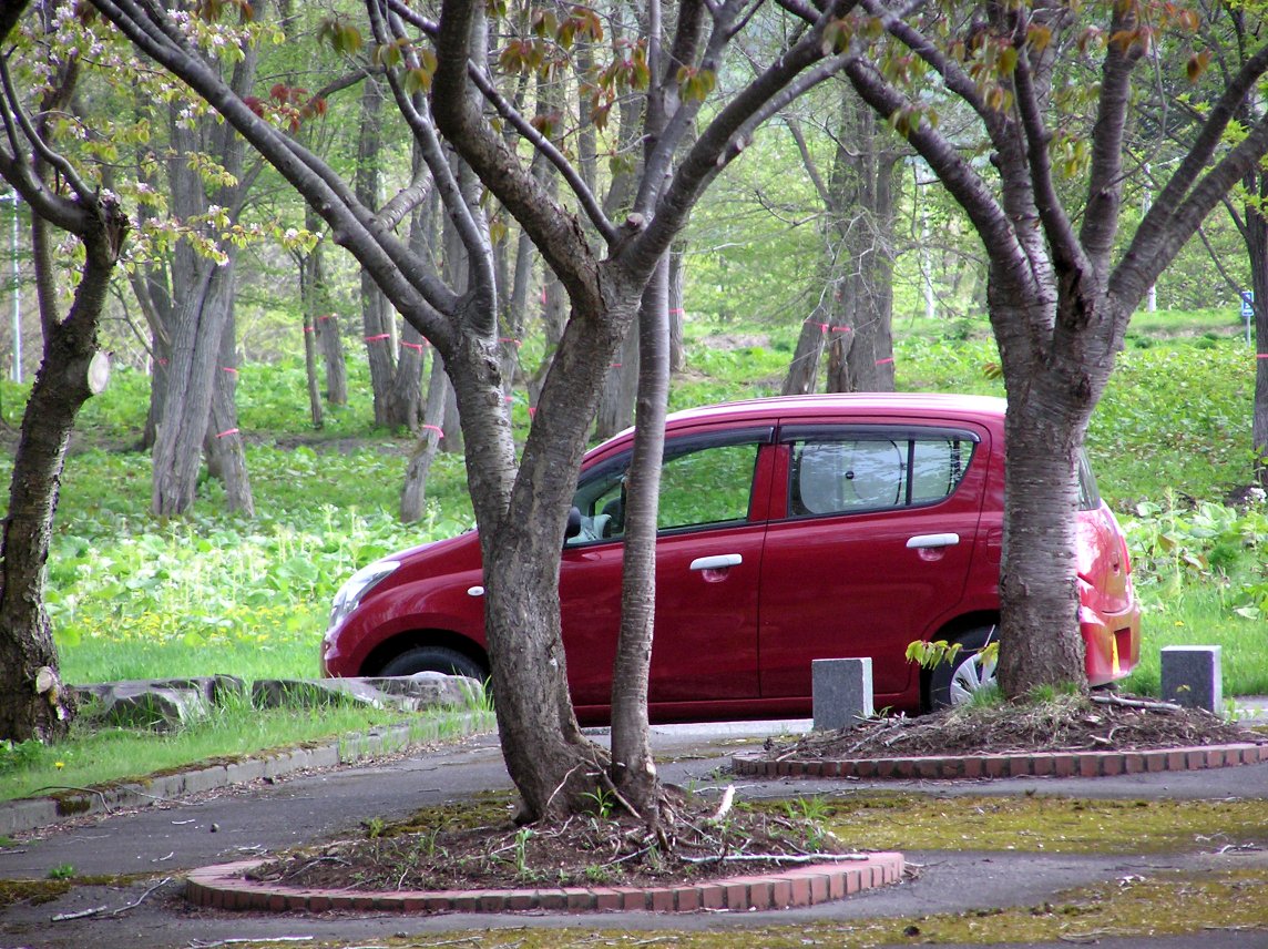 緑の中に赤い車が映えてますね!